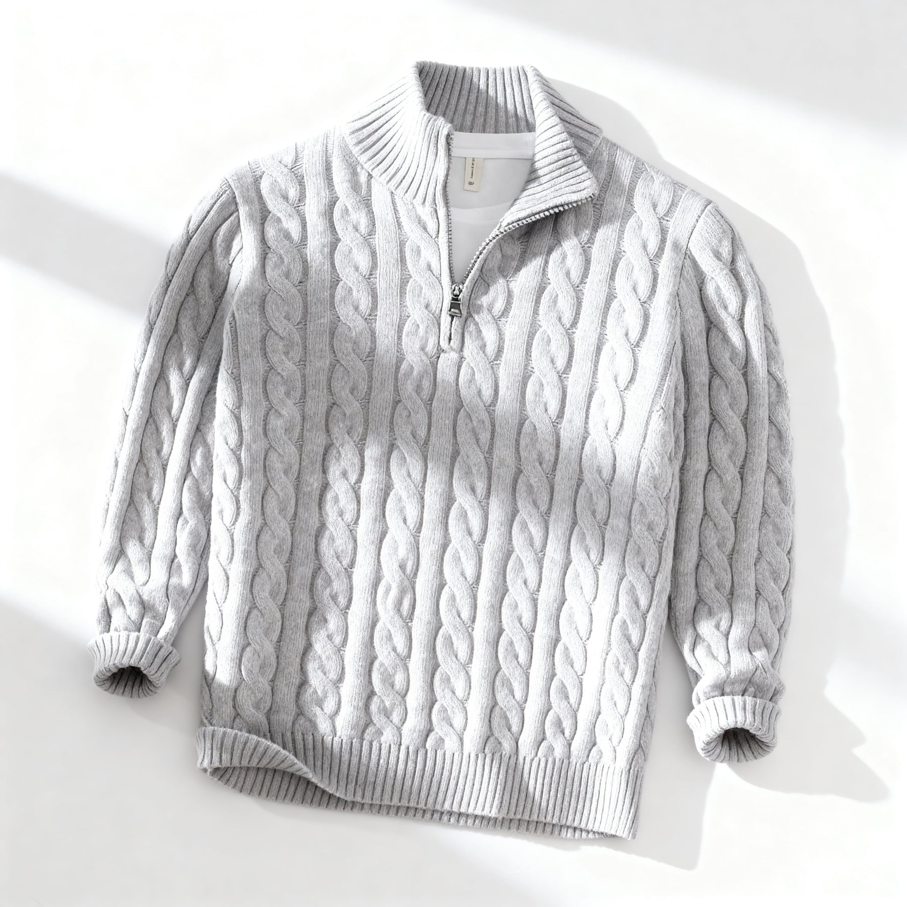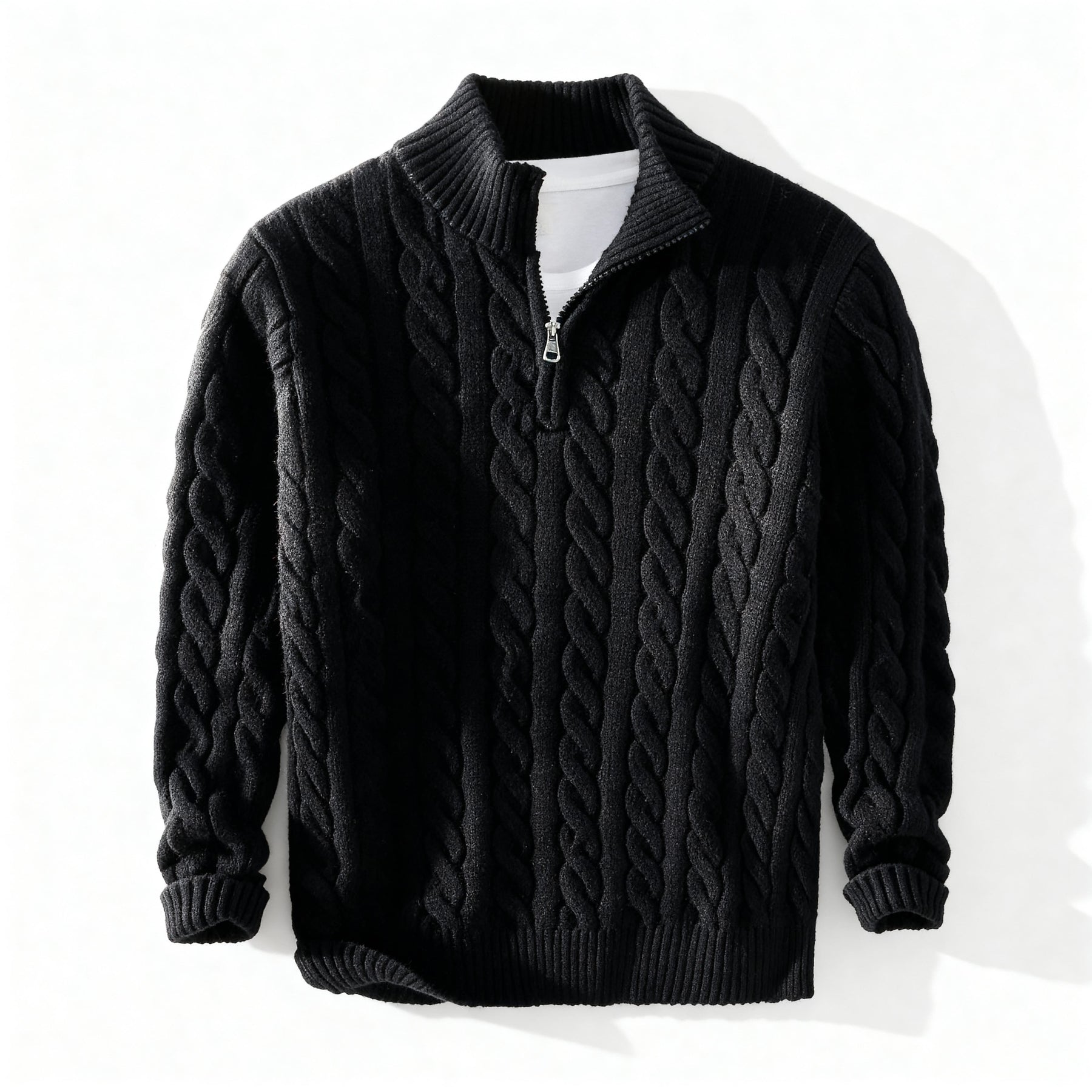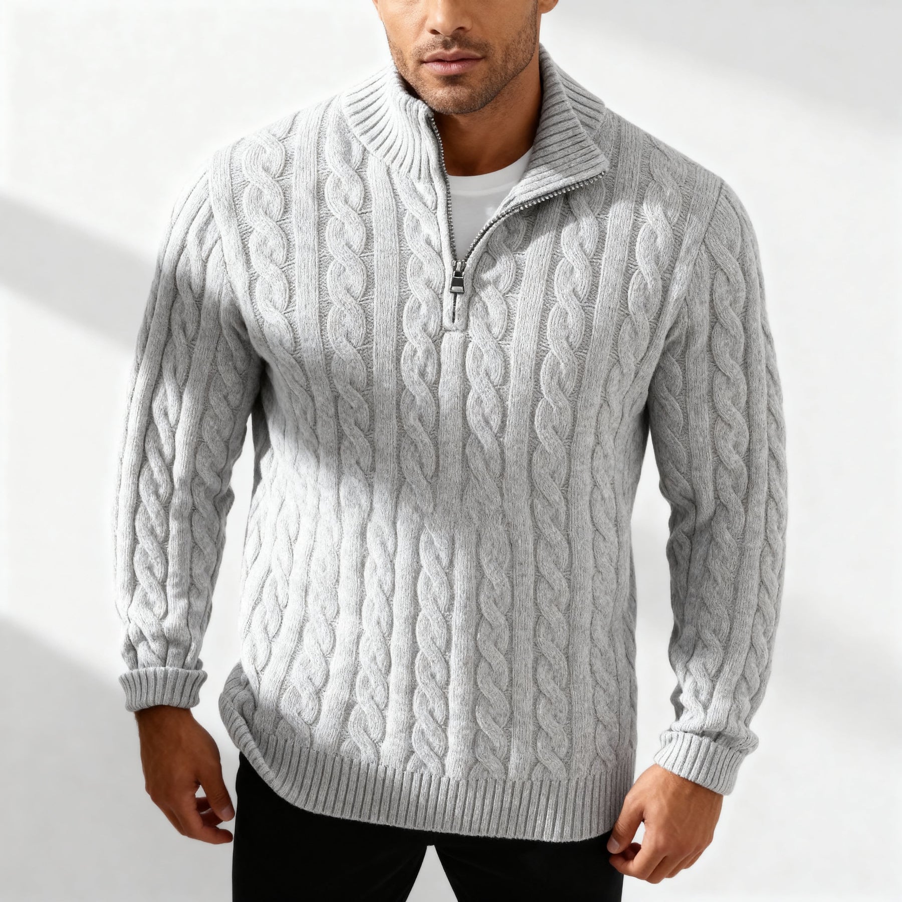 Men’s cable-knit half-zip sweater with a heavyweight cotton blend for all-day warmth and structure. The raised cable pattern adds visual depth and texture, complemented by a ribbed stand collar and cuffs for a refined, versatile finish. Perfect for layering in cool weather, this sweater blends classic knit style with modern comfort and durability.